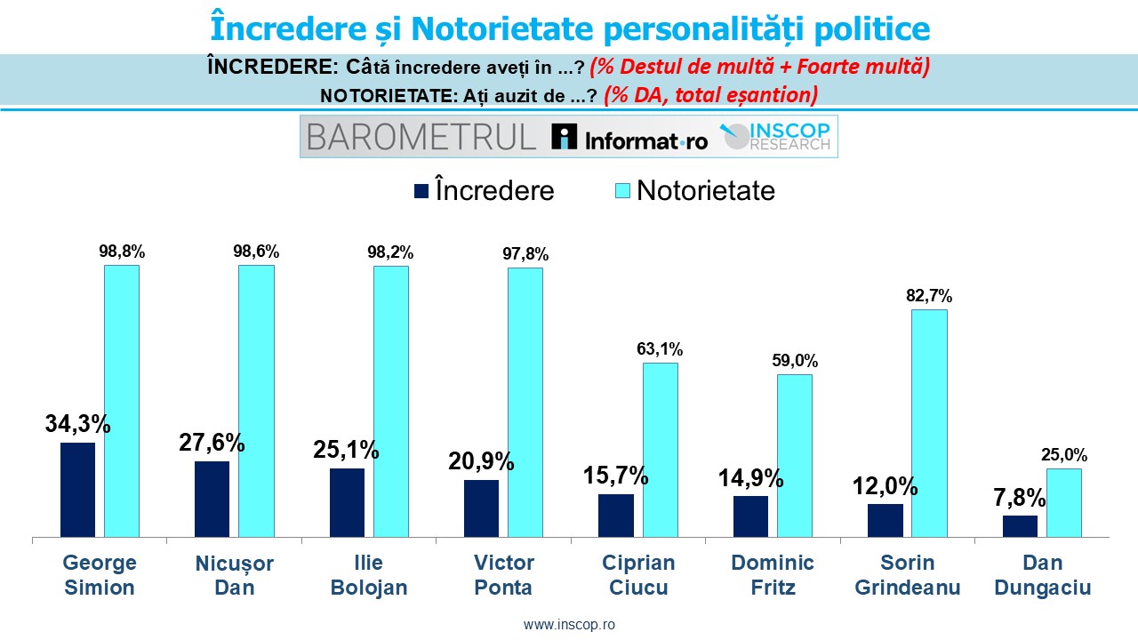 DIGI24: INSCOP Research a publicat, marți, rezultatele celui mai recent Barometru Informat.ro – INSCOP Research, realizat în perioada 2–6 martie 2026, care arată nivelul de încredere al românilor în principalele personalități politice. Potrivit sondajului, liderul AUR George Simion se află pe primul loc în clasamentul încrederii, urmat de președintele Nicușor Dan și de premierul Ilie Bolojan. Conform datelor colectate în sondaj, 34,3% dintre respondenți spun că au „foarte multă” sau „destul de multă” încredere în George Simion. Pe locul al doilea se situează Nicușor Dan, cu 27,6%, iar pe locul al treilea Ilie Bolojan, cu 25,1%.