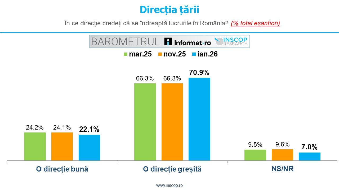 Pentru mai multe detalii: https://www.radiocluj.ro/2026/01/23/sondaj-7-din-10-romani-cred-ca-tara-merge-intr-o-directie-gresita/