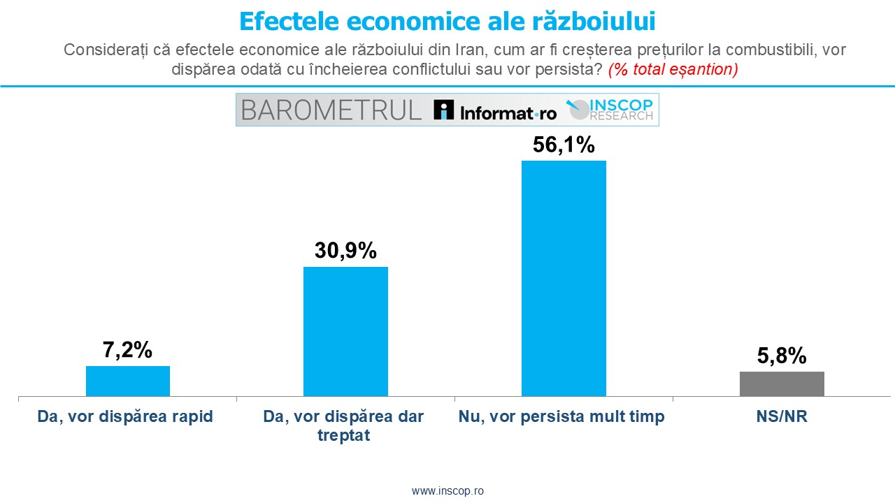 7.2% dintre români consideră că efectele economice ale războiului din Iran, precum creșterea prețurilor la combustibili, vor dispărea rapid odată cu încheierea conflictului. 30.9% cred că efectele vor dispărea, dar treptat, în timp ce 56.1% sunt de părere că acestea vor persista o perioadă îndelungată. Ponderea non-răspunsurilor este de 5.8%.