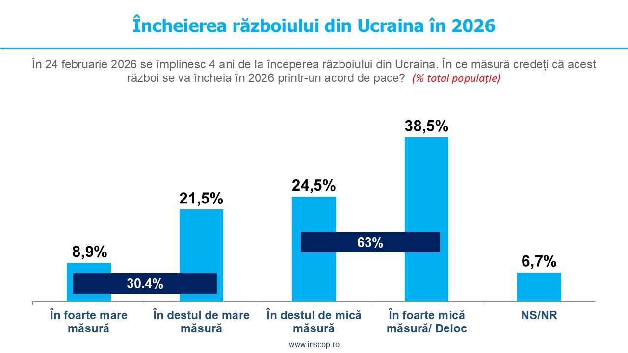 Conform sondajului ”4 ani de război în Ucraina. Impactul profund asupra opiniei publice din România”, realizat de INSCOP Research la solicitarea New Strategy Center, doar 3 din 10 români cred că războiul din țara vecină se va încheia în 2026 printr-un acord de pace. De asemenea, aproape o treime dintre cei intervievați sunt de părere că în următorii 3 ani Rusia va declanșa un nou război în Europa.