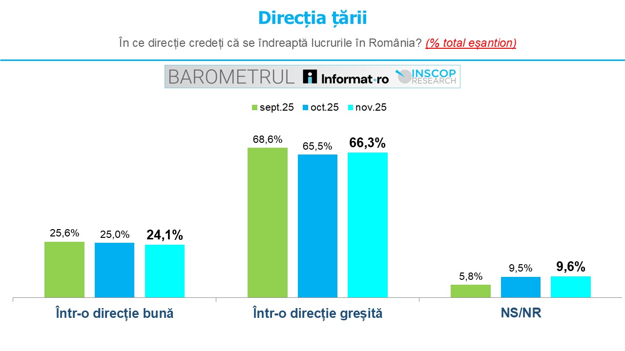 În luna noiembrie, 24% dintre români consideră că direcția în care merge România este una bună, în timp ce 66,3% sunt de părere că direcția este una proastă. Este doar una dintre concluziile BAROMETRULUI Informat.ro – INSCOP Research, ediția a V-a, realizat în perioada 25 octombrie – 2 noiembrie 2025.