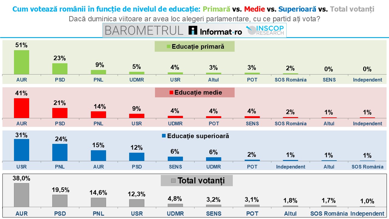 Dacă duminica viitoare ar avea loc alegeri parlamentare, 51% dintre persoanele cu educație primară și 41% dintre cei cu educație medie ar vota cu AUR, în timp ce prima poziție în topul intenției de vot al persoanelor cu educație superioară ar fi ocupată de USR, cu 31%. Sunt doar câteva dintre datele oferite de BAROMETRUL Informat.ro – INSCOP Research, ediția a V-a, realizat în perioada 25 octombrie – 2 noiembrie 2025.