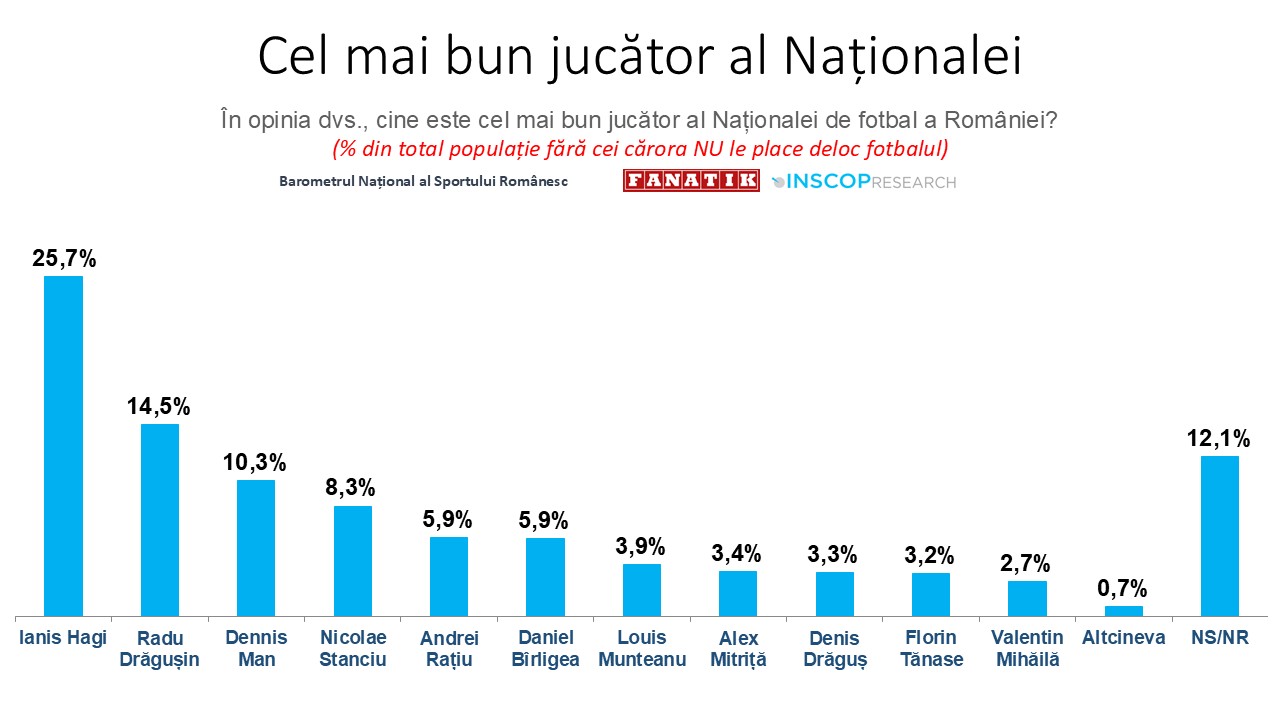 Întrebați cine este cel mai bun jucător al Naționalei de fotbal a României, 25.7% dintre cei cărora le place fotbalul cred că este Ianis Hagi, 14.5% Radu Drăgușin, 10.3% Dennis Man, 8.3% Nicolae Stanciu, 5.9% Andrei Rațiu, 5.9% Daniel Bîrligea, 3.9% Louis Munteanu, 3.4% Alex Mitriță, 3.3% Denis Drăguș, 3.2% Florin Tănase, iar 2.7% Valentin Mihăilă. 0.7% aleg pe altcineva. 12.1% nu știu sau nu răspund.